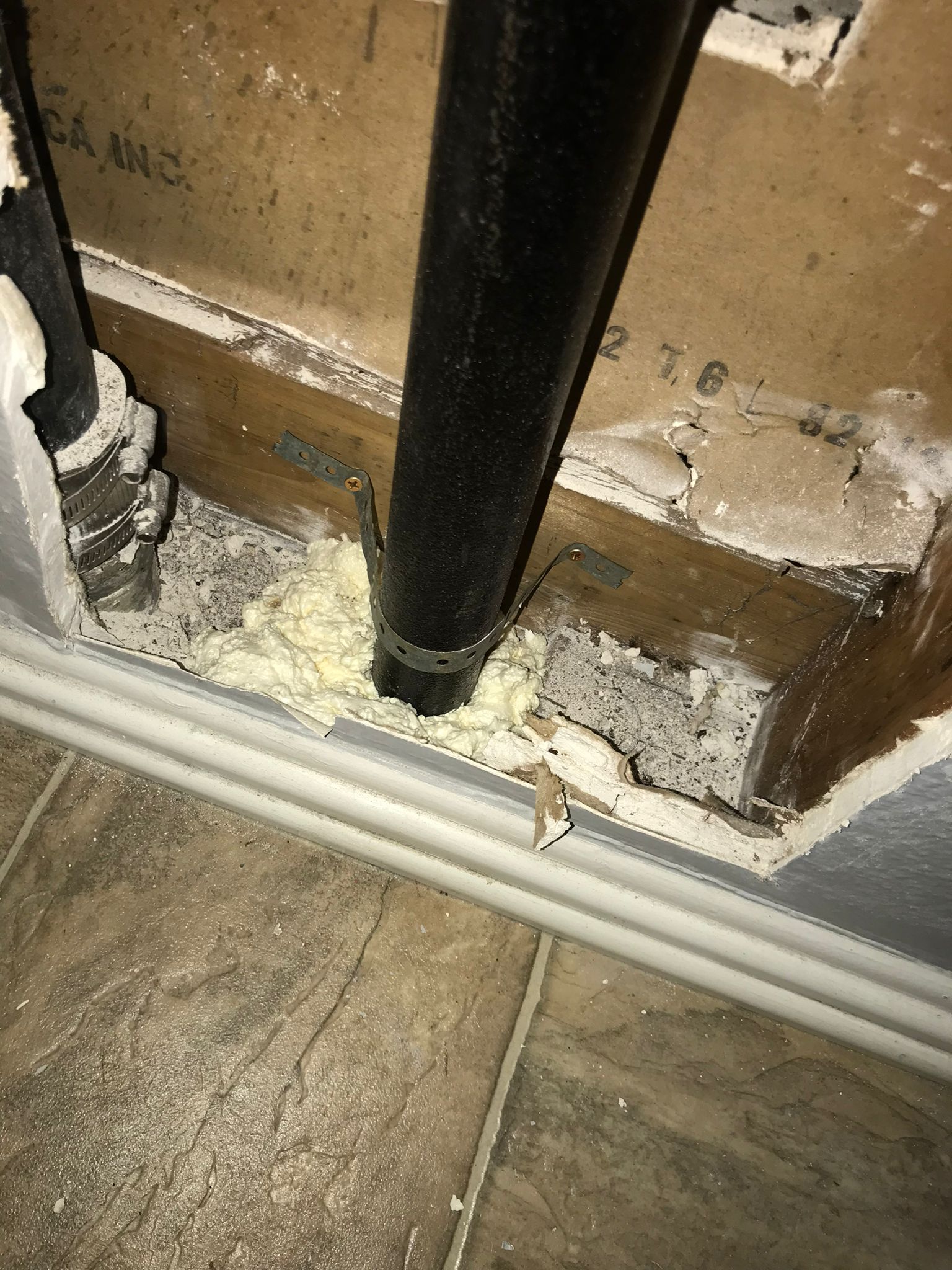 • Upon opening the drywall, we discovered a 2-inch cast-iron drain pipe, running from the second floor to the first floor and connecting to the main sewer line in the garage area, with a 12-foot crack.