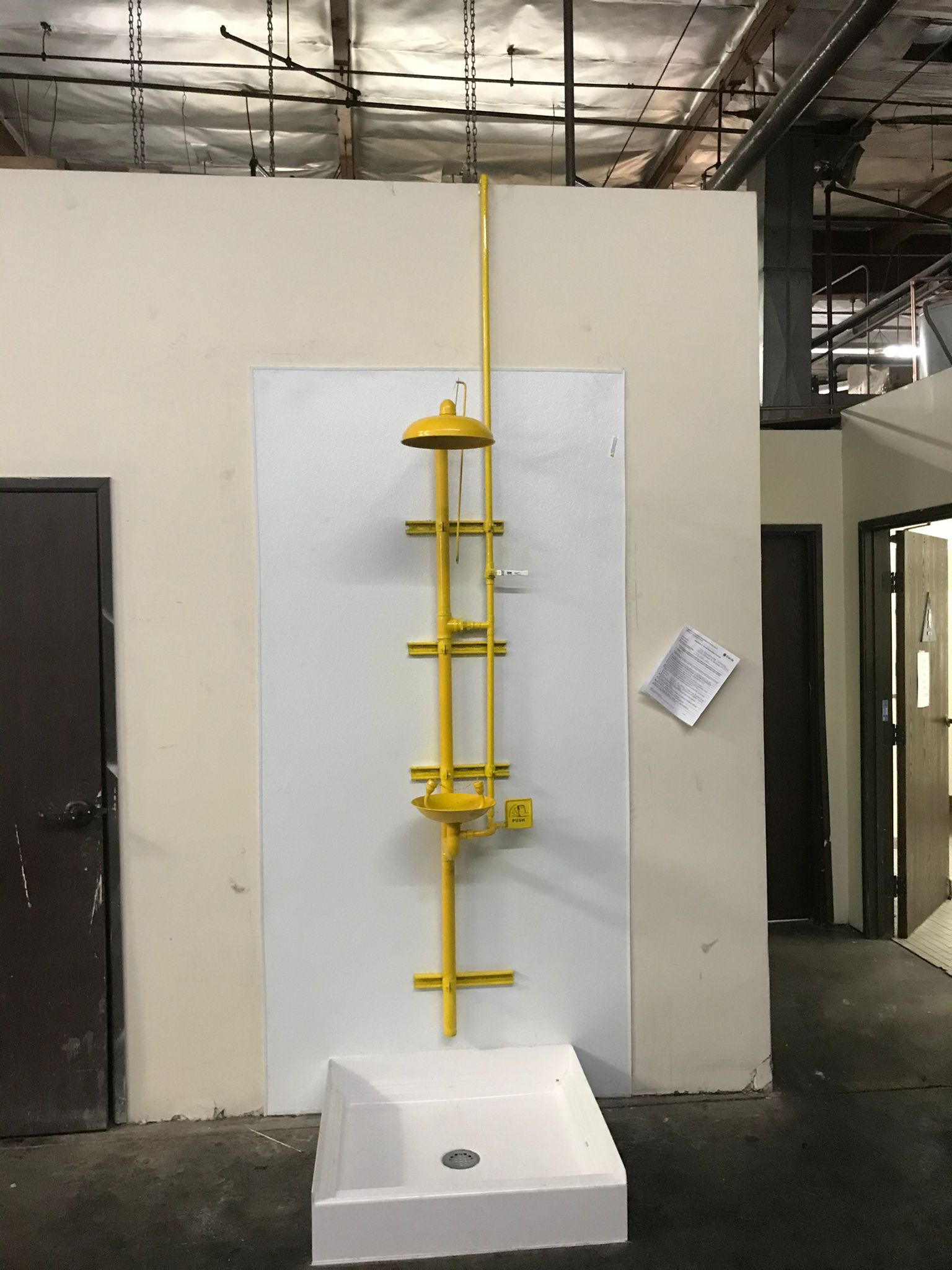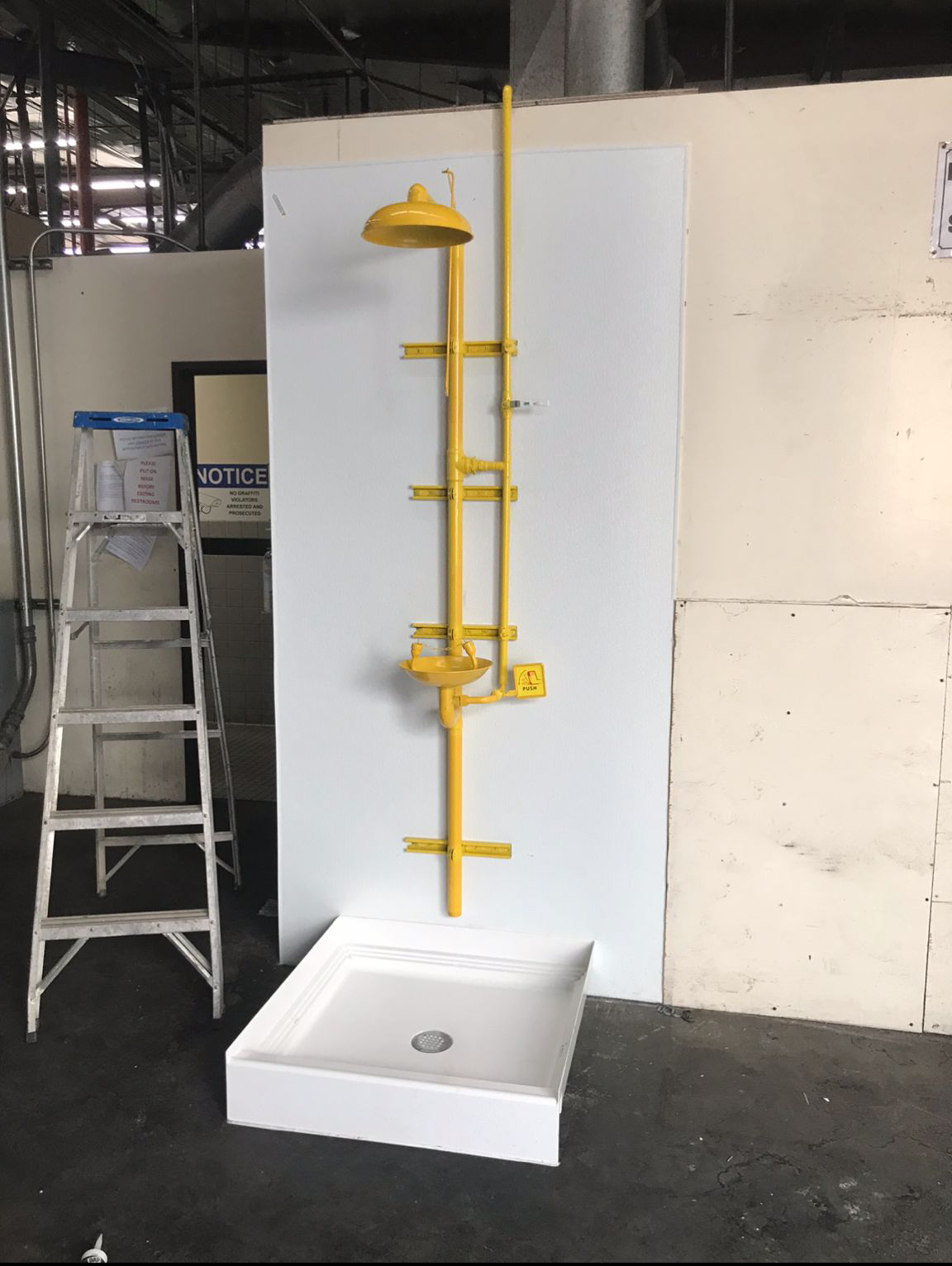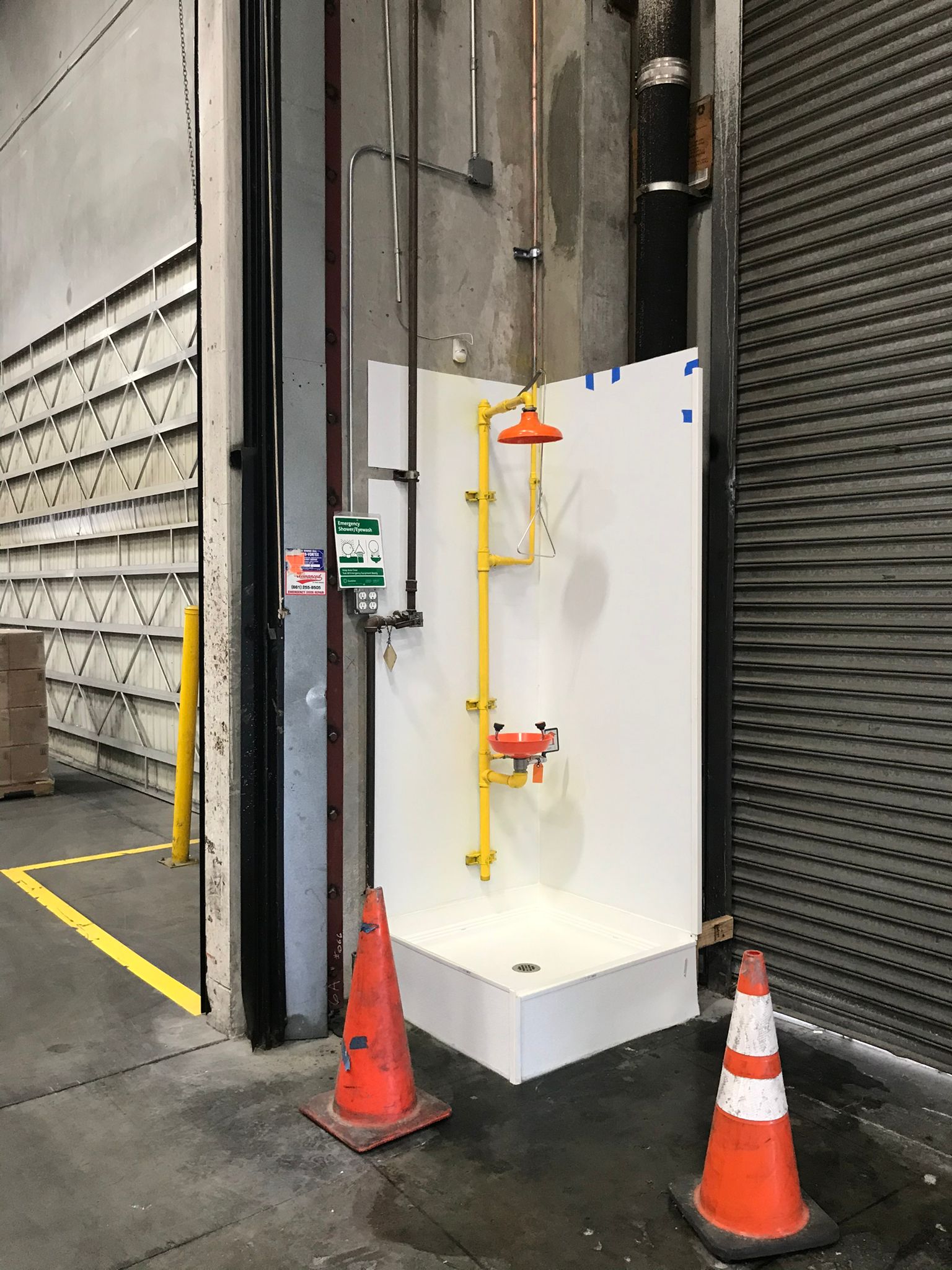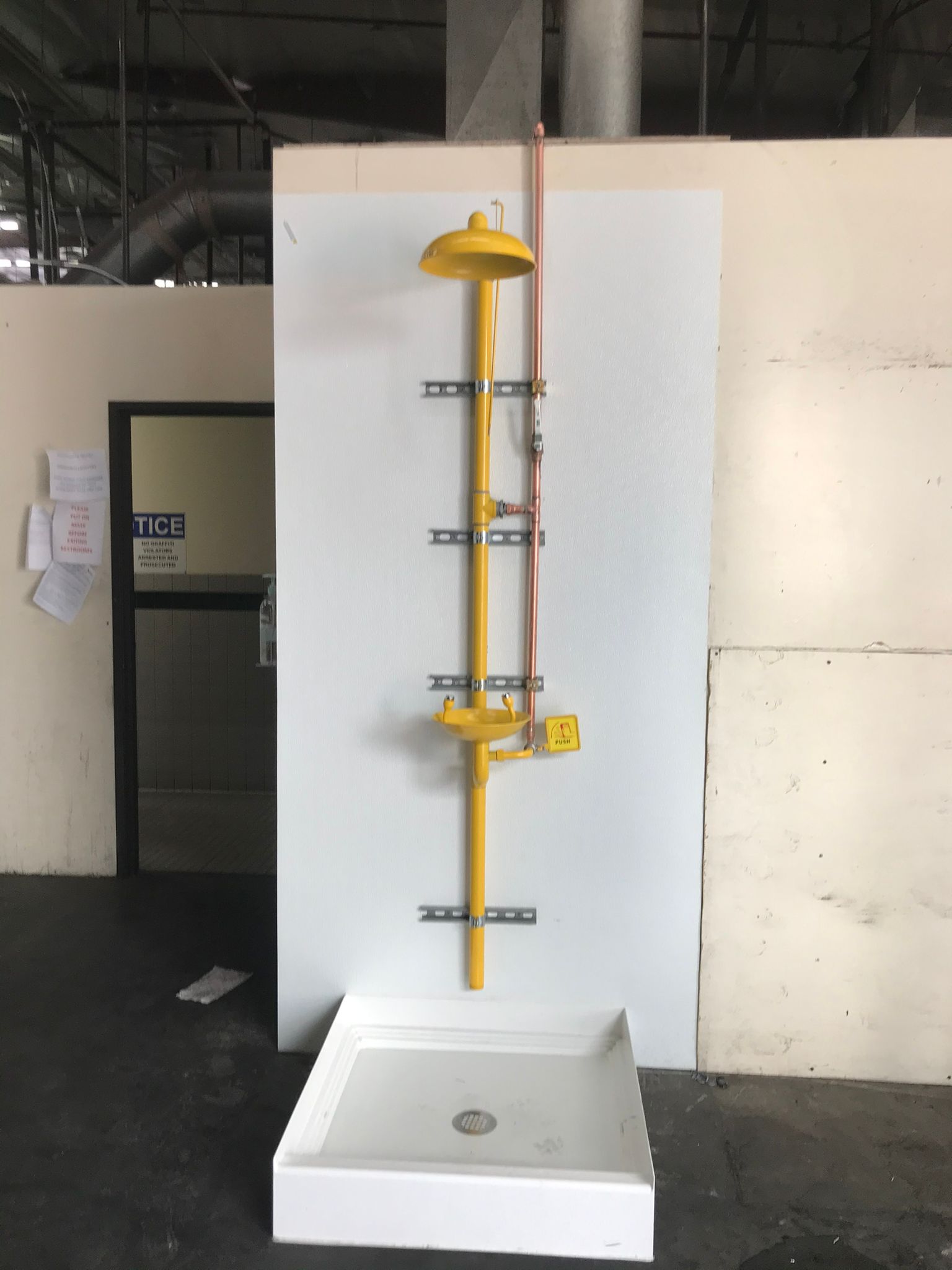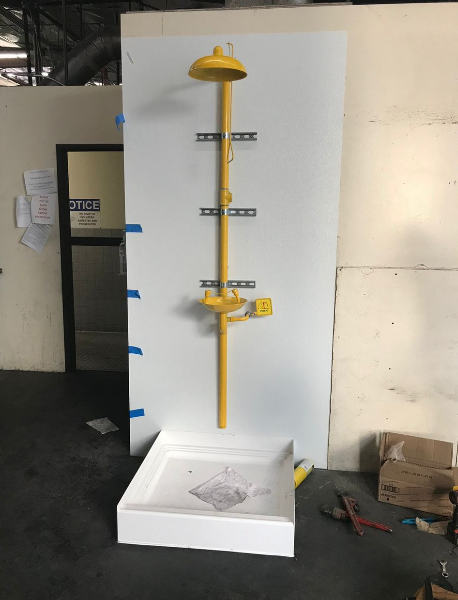 • A small basin was installed and connected to the sewer line to manage any water flow from the emergency shower.